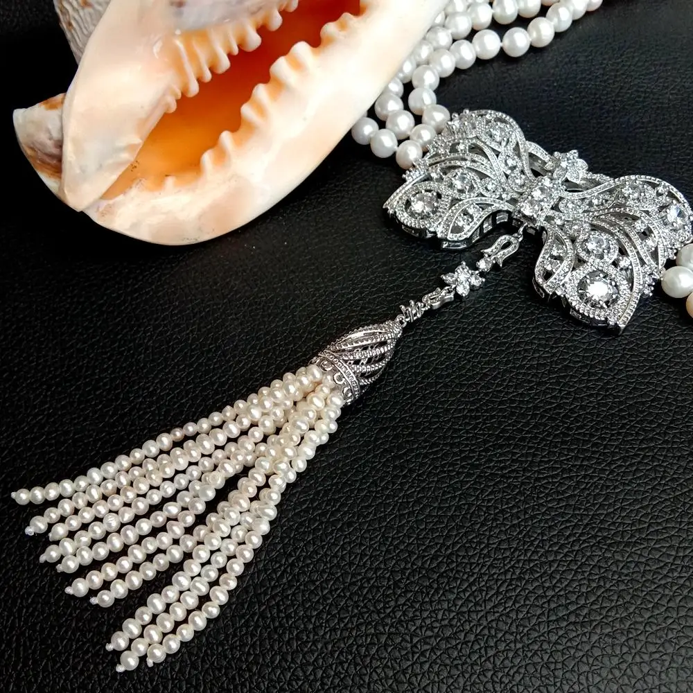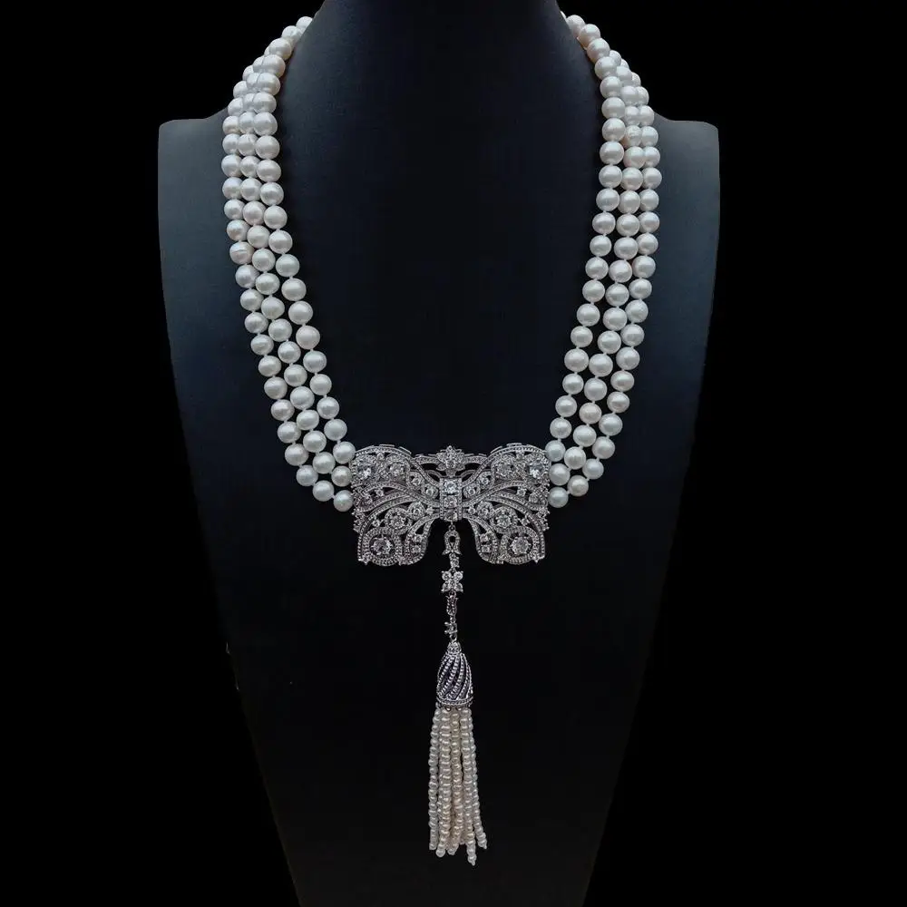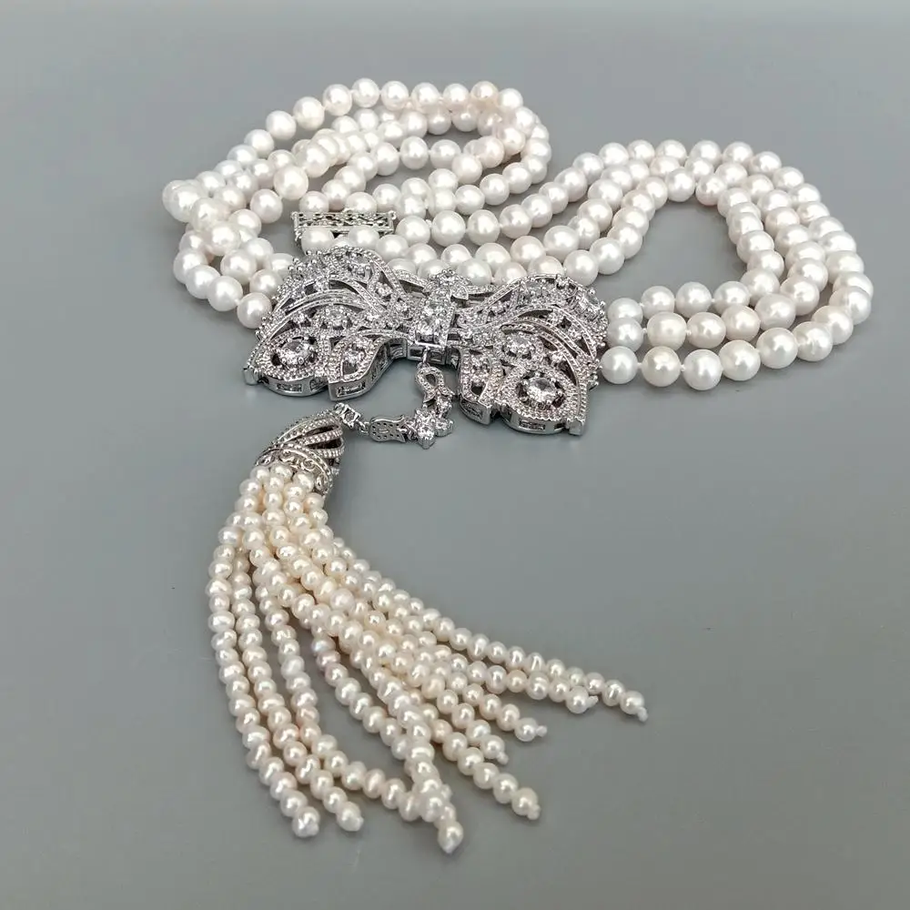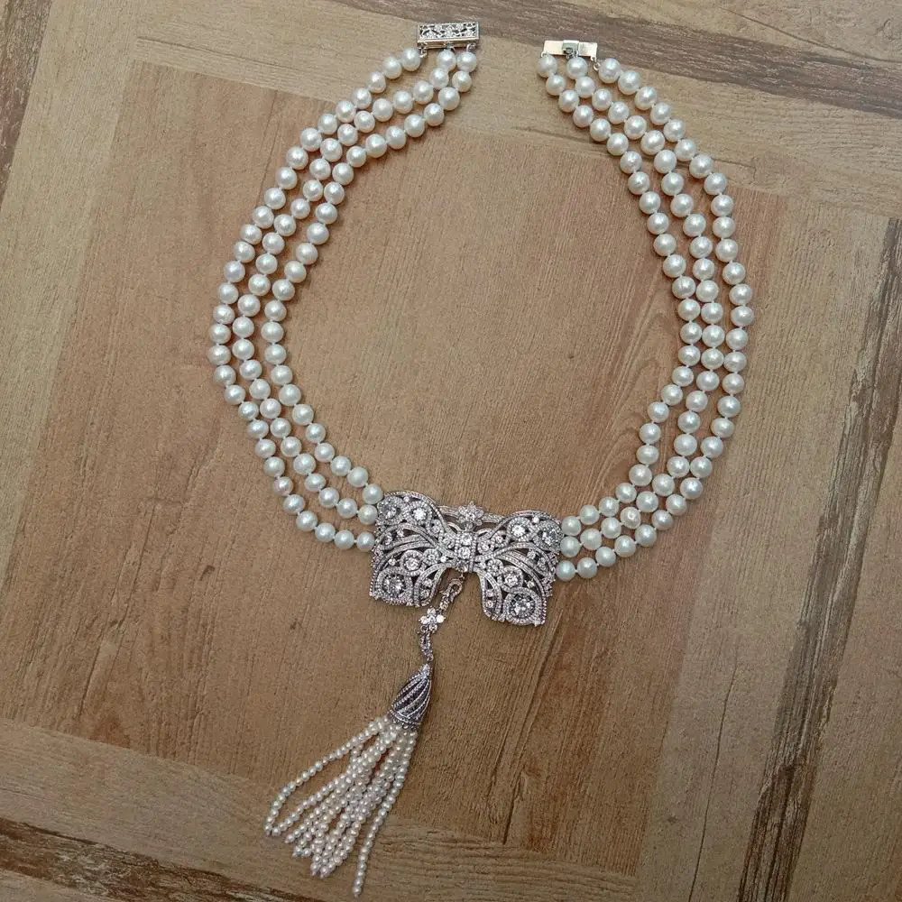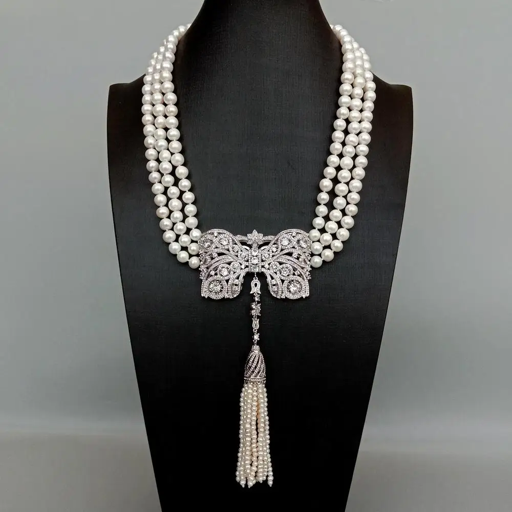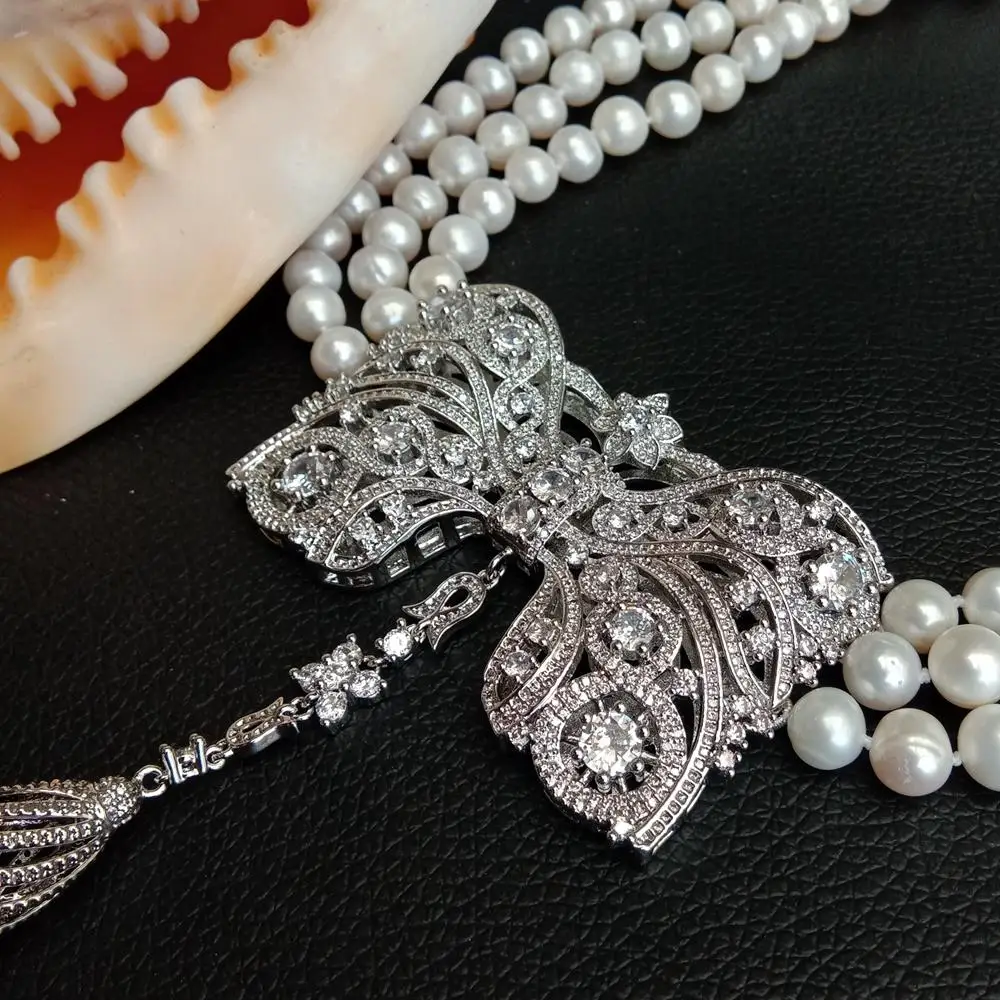 3 Strands Freshwater Cultured White Pearl Necklace Bowknot Shape Cubic Zirconia Pave Tassel Pendant