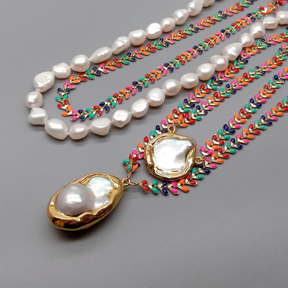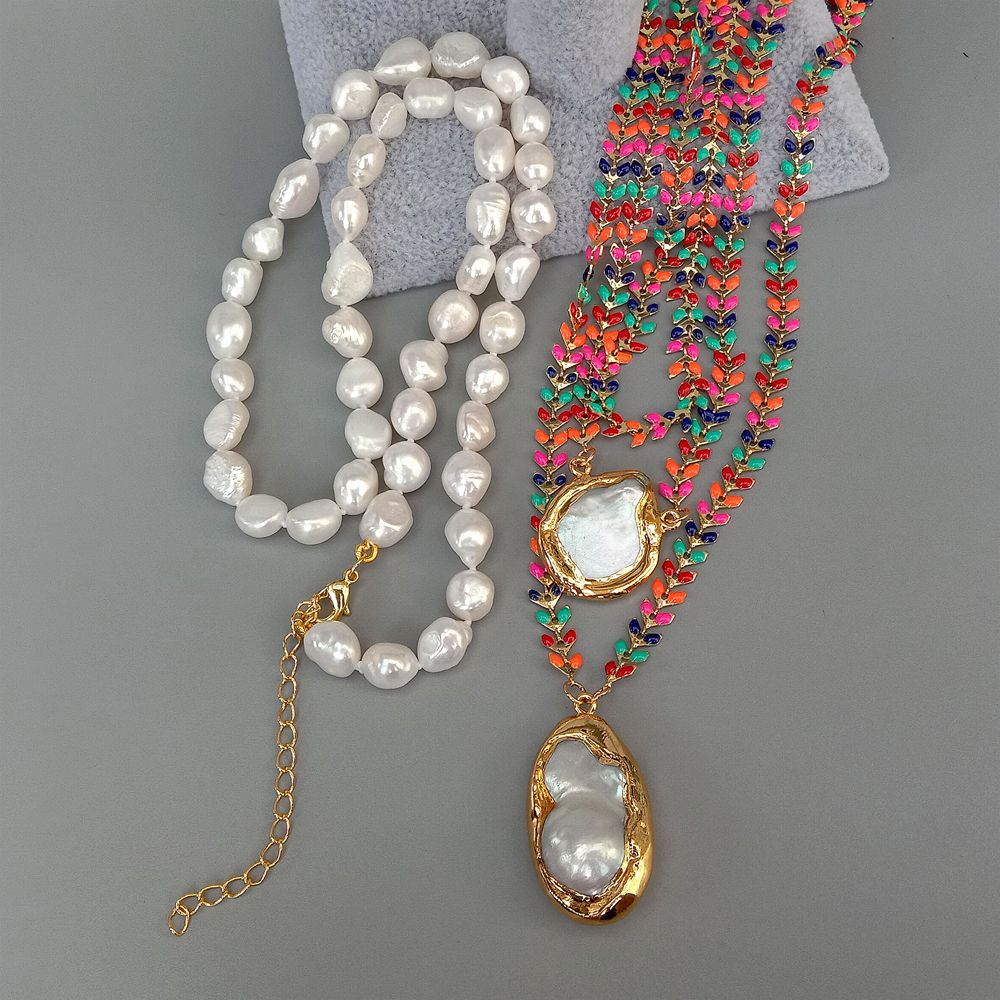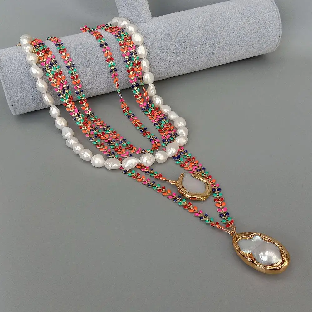 Multi Color Enamel Chain Cultured White Baroque Pearl statement Necklace Keshi Pearl Charm Pendant necklace for women