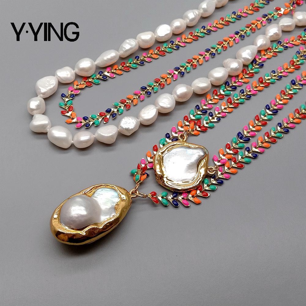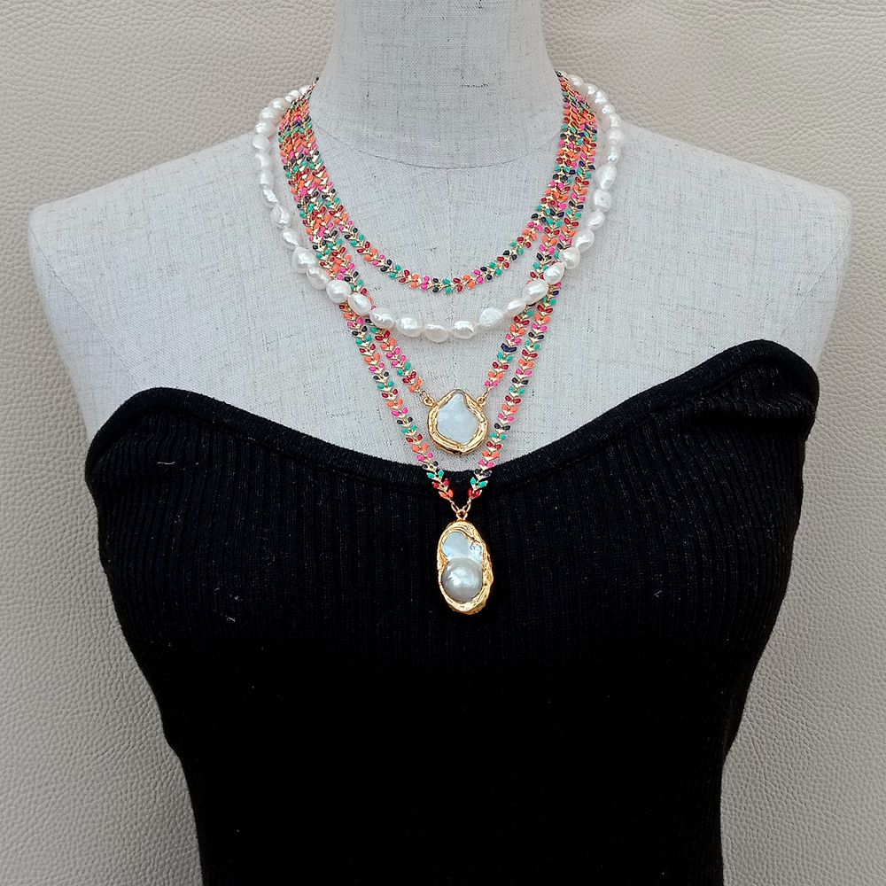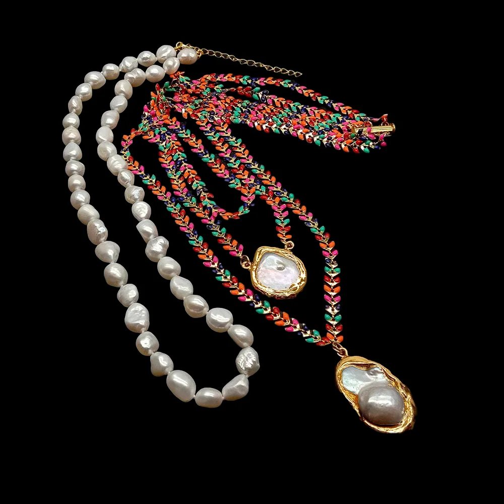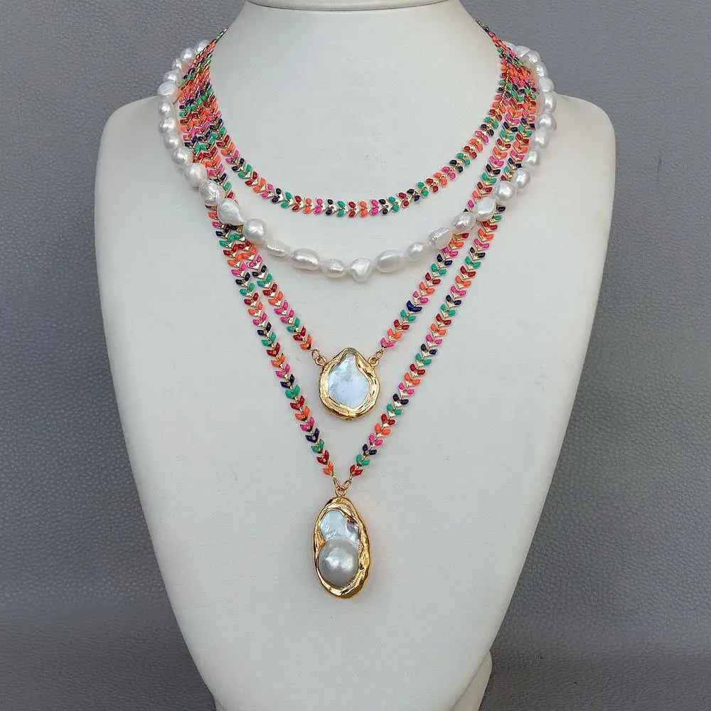 Multi Color Enamel Chain Cultured White Baroque Pearl statement Necklace Keshi Pearl Charm Pendant necklace for women