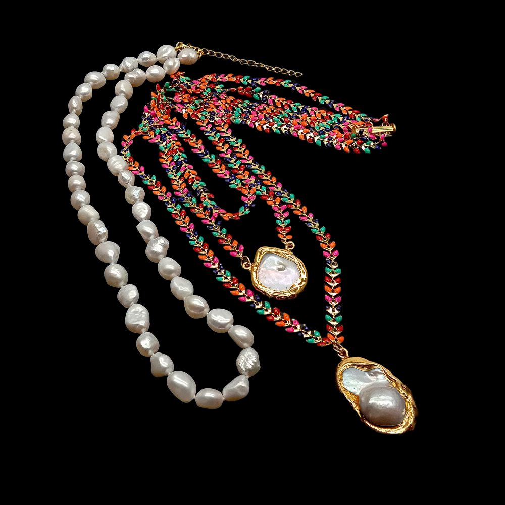 • Multi Color Enamel Chain Cultured White Baroque Pearl statement Necklace Keshi Pearl Charm Pendant necklace for women