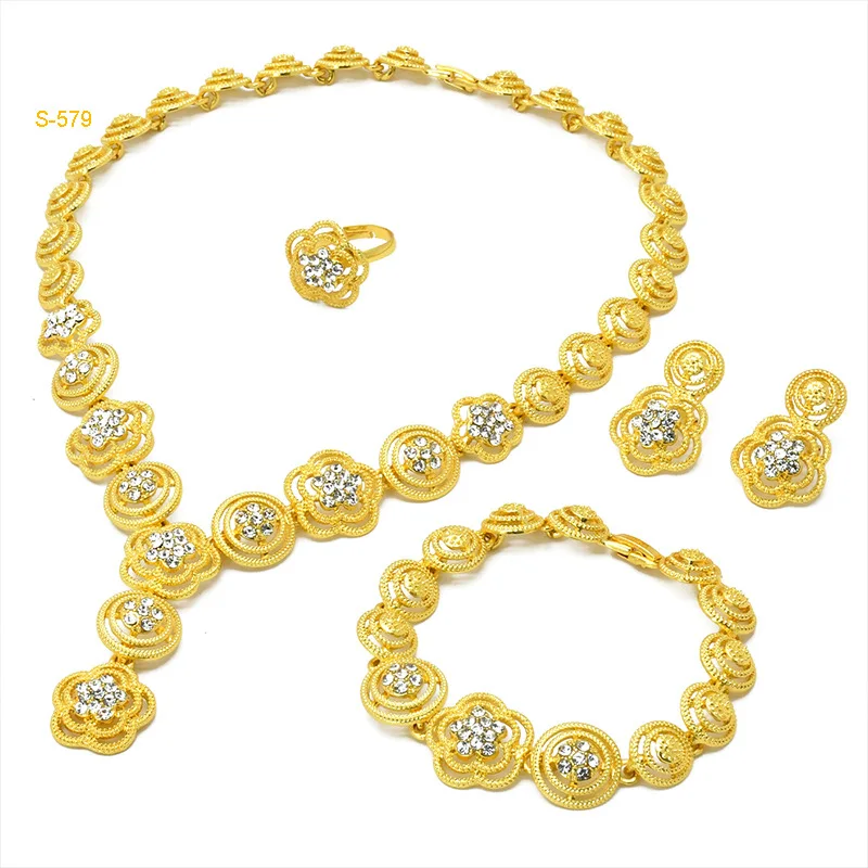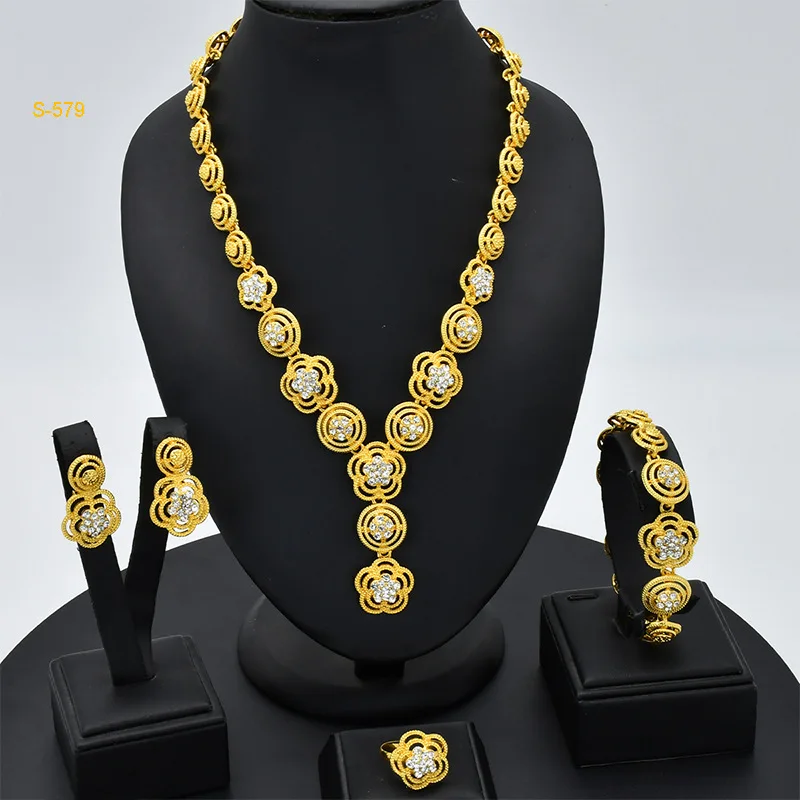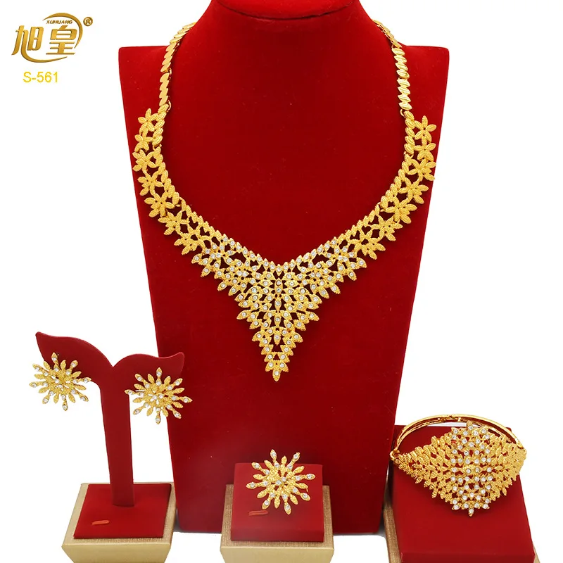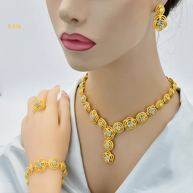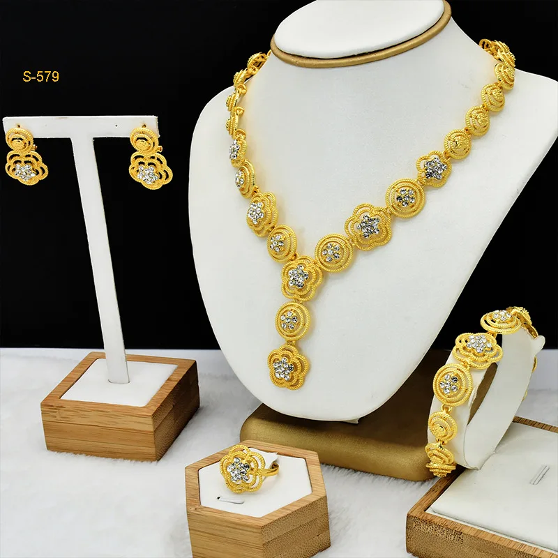 • Diamond-Studded Floral Elegant Necklace Bracelet Earrings Ring 4-Piece Set Women 24K Gold AU999 - Lightweight, stackable