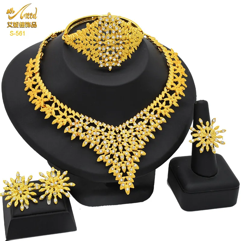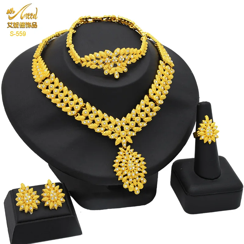 Diamond-Studded Floral Elegant Necklace Bracelet Earrings Ring 4-Piece Set Women 24K Gold AU999 - Lightweight, stackable