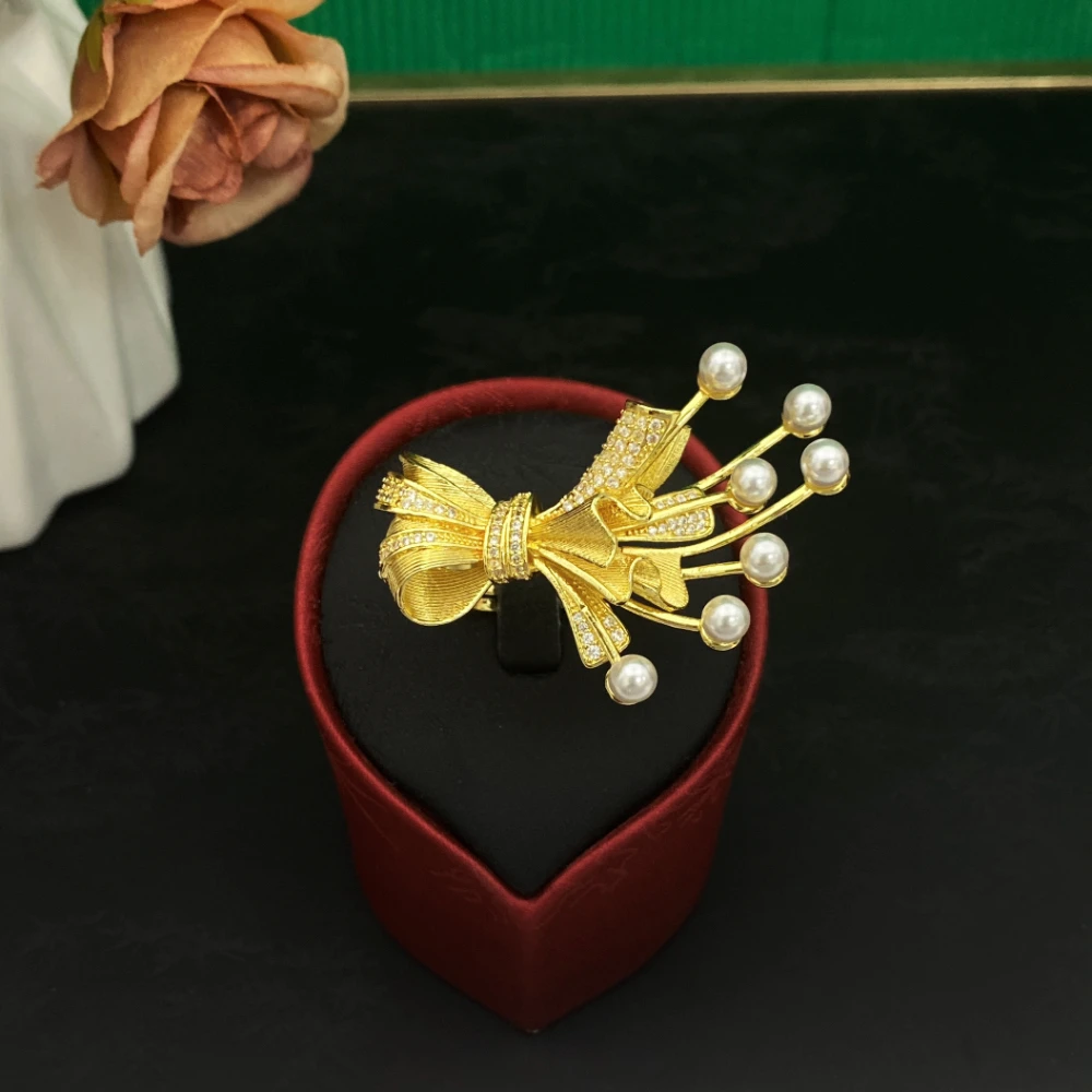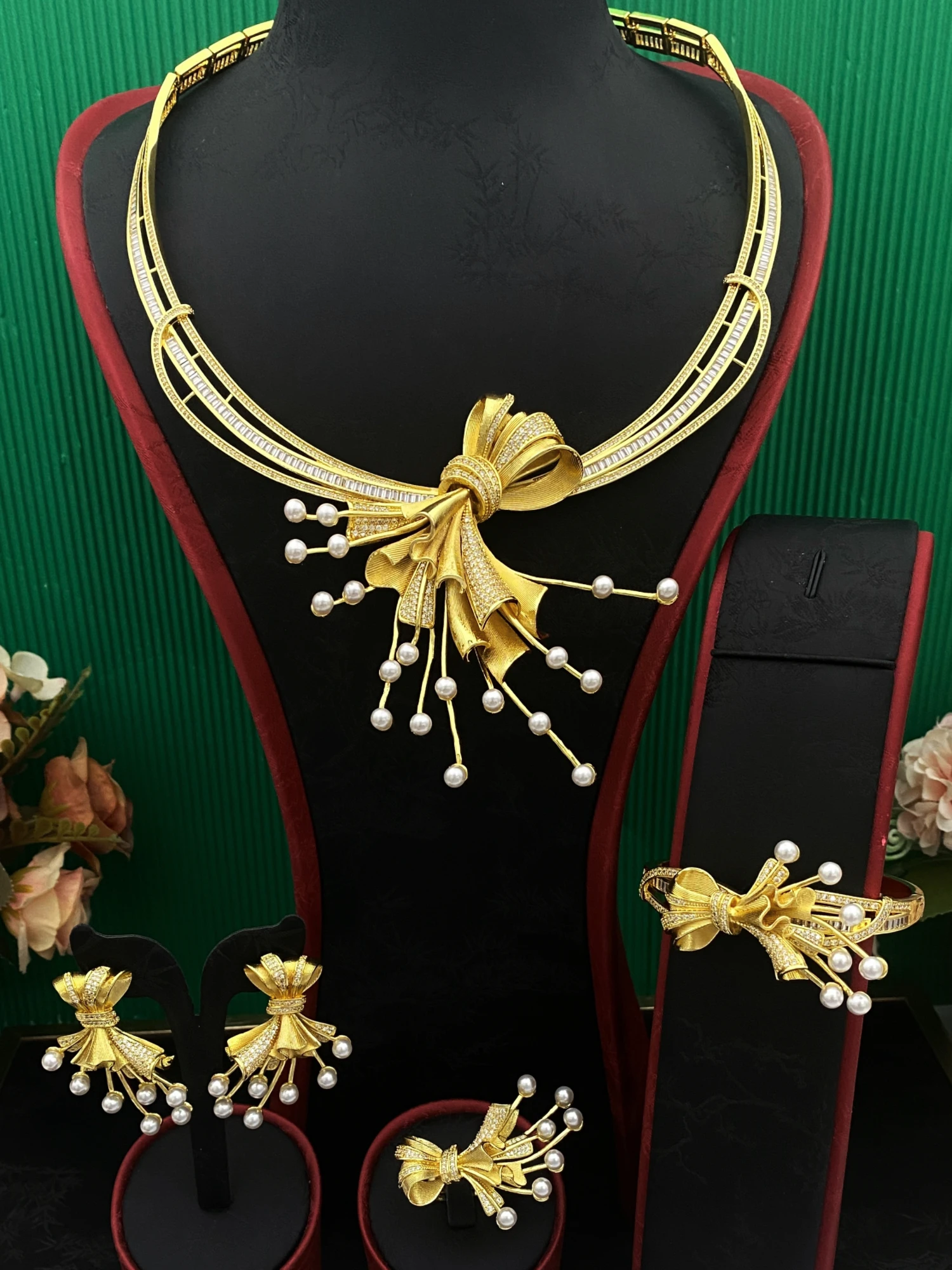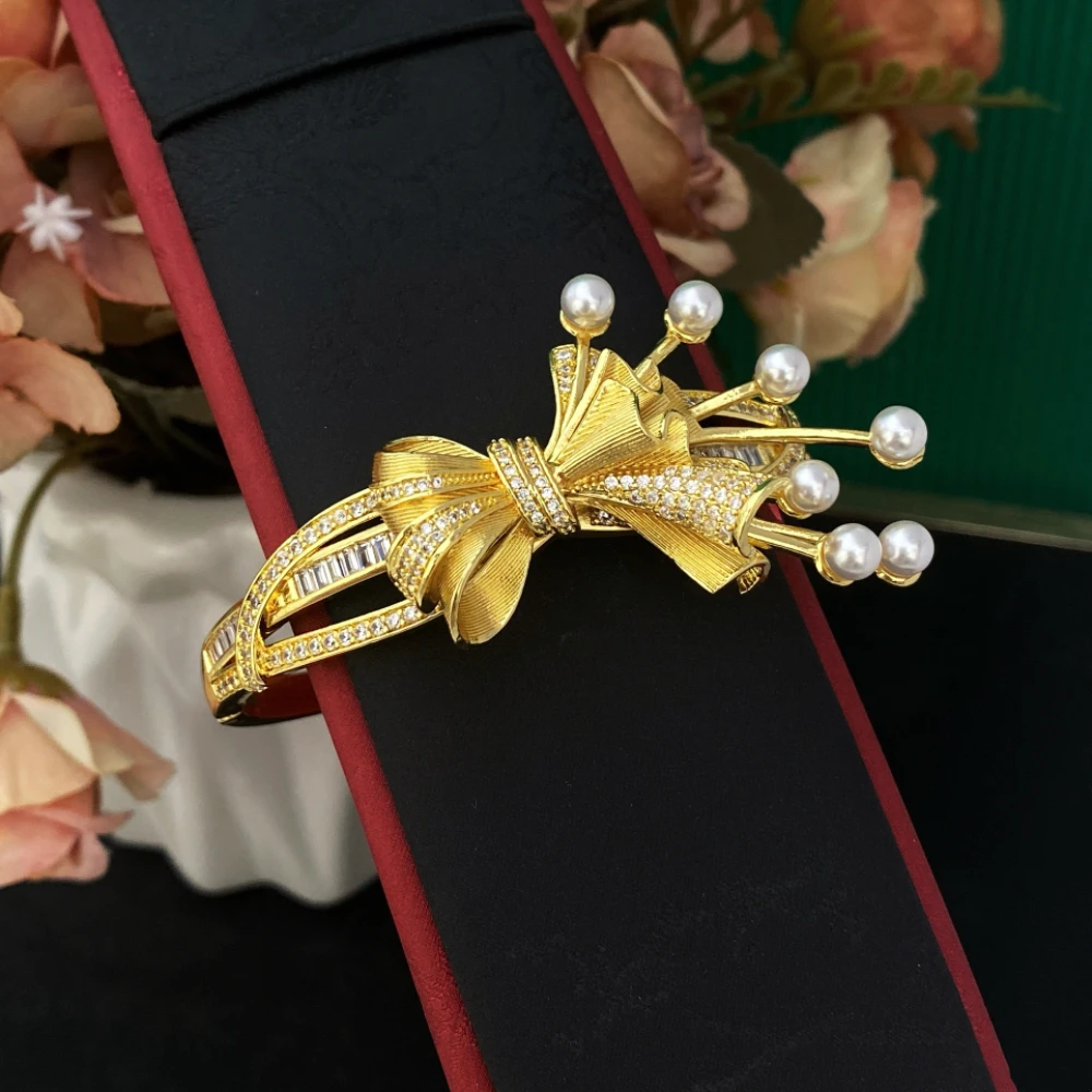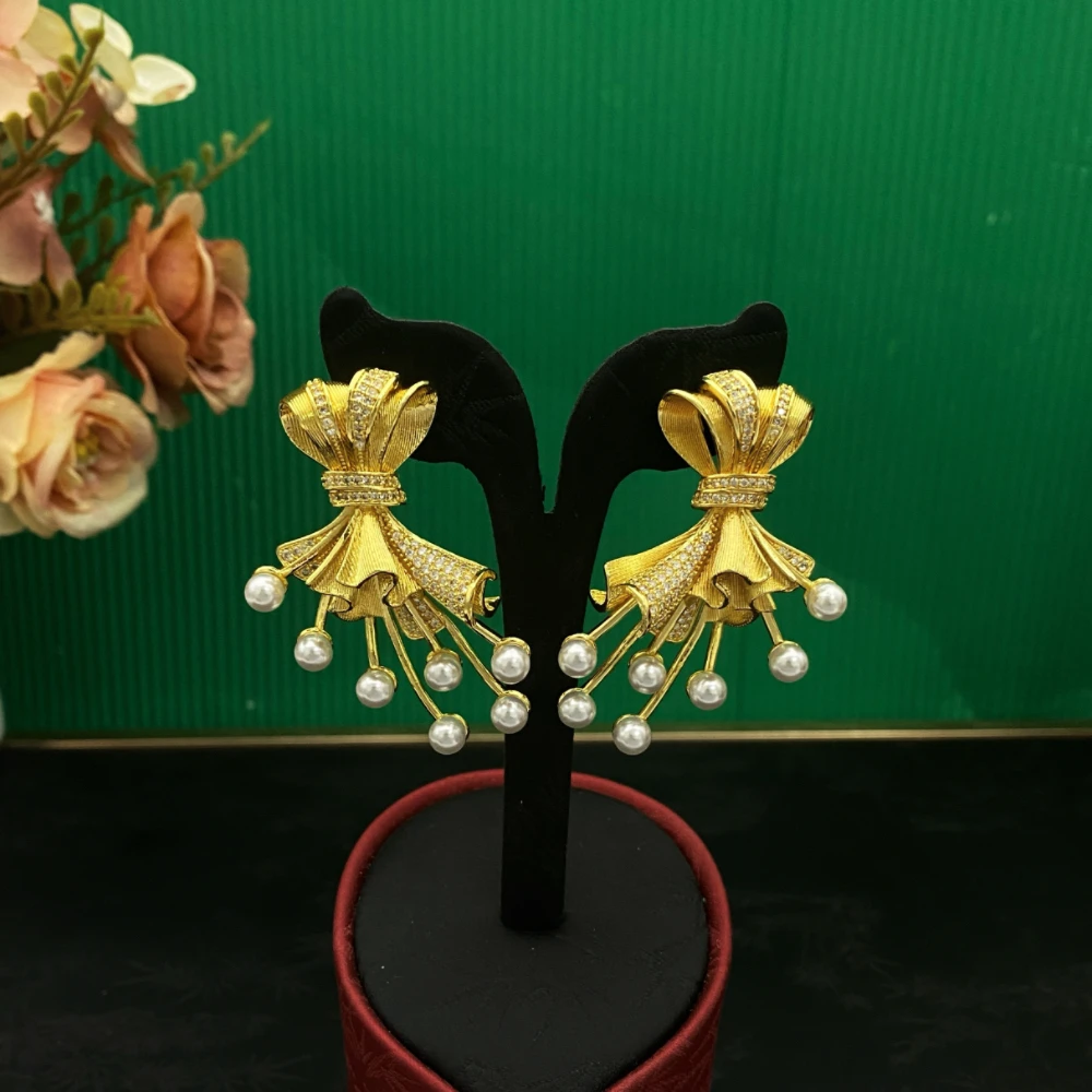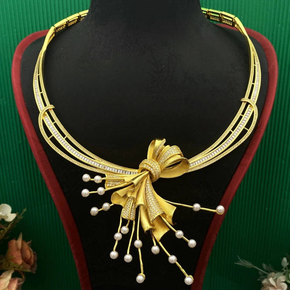 • Dubai Bridal Zircon Bows of Pearls Jewelry Set Gold-Plated Copper Women's Bracelet Ring Necklace Earrings Luxury Wedding