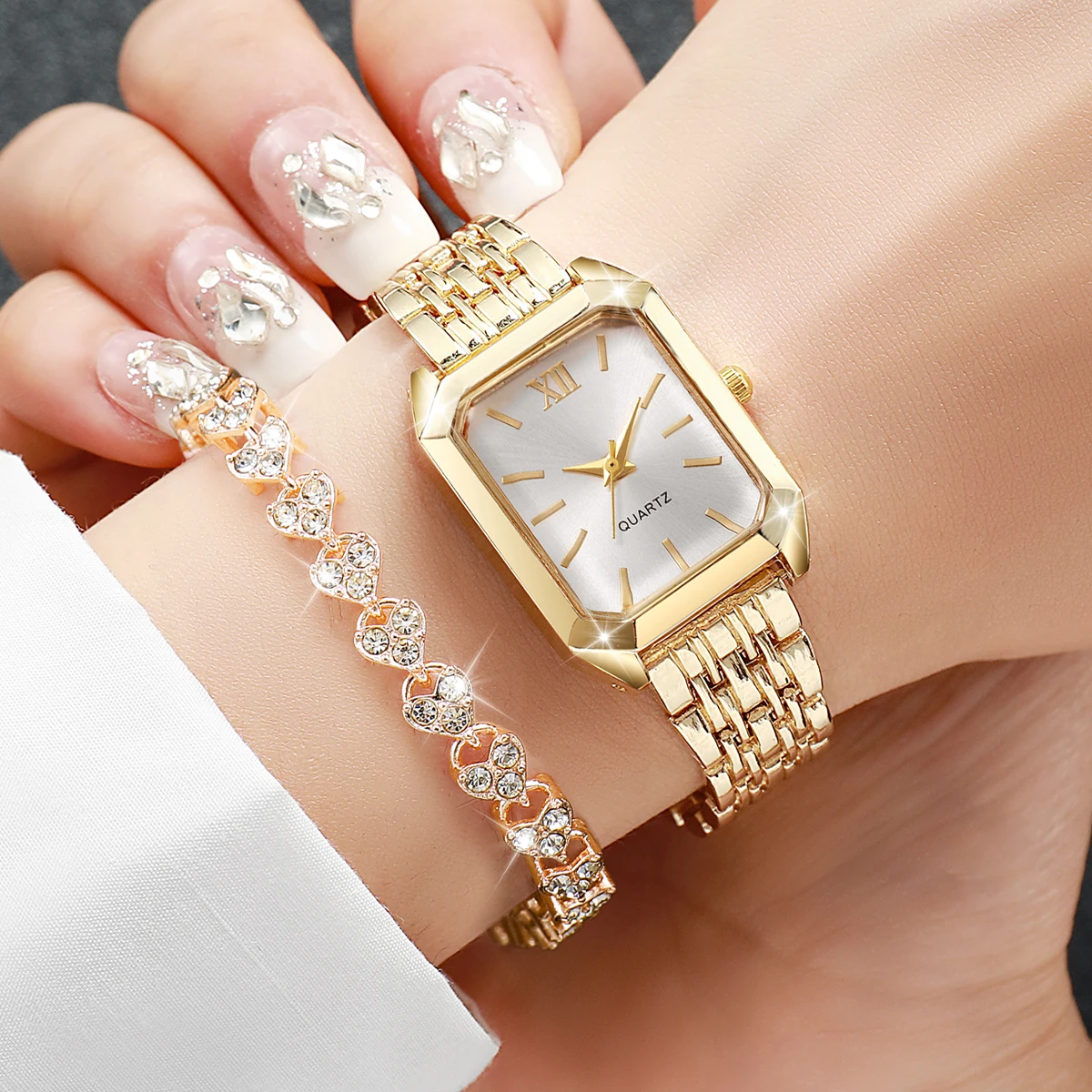 • 2PCS Fashion Rectangle Women Quartz Watch Rhinestone Bracelet Set Ladies Roma Dial Wristwatch Reloj Mujer Girls Clock Gift