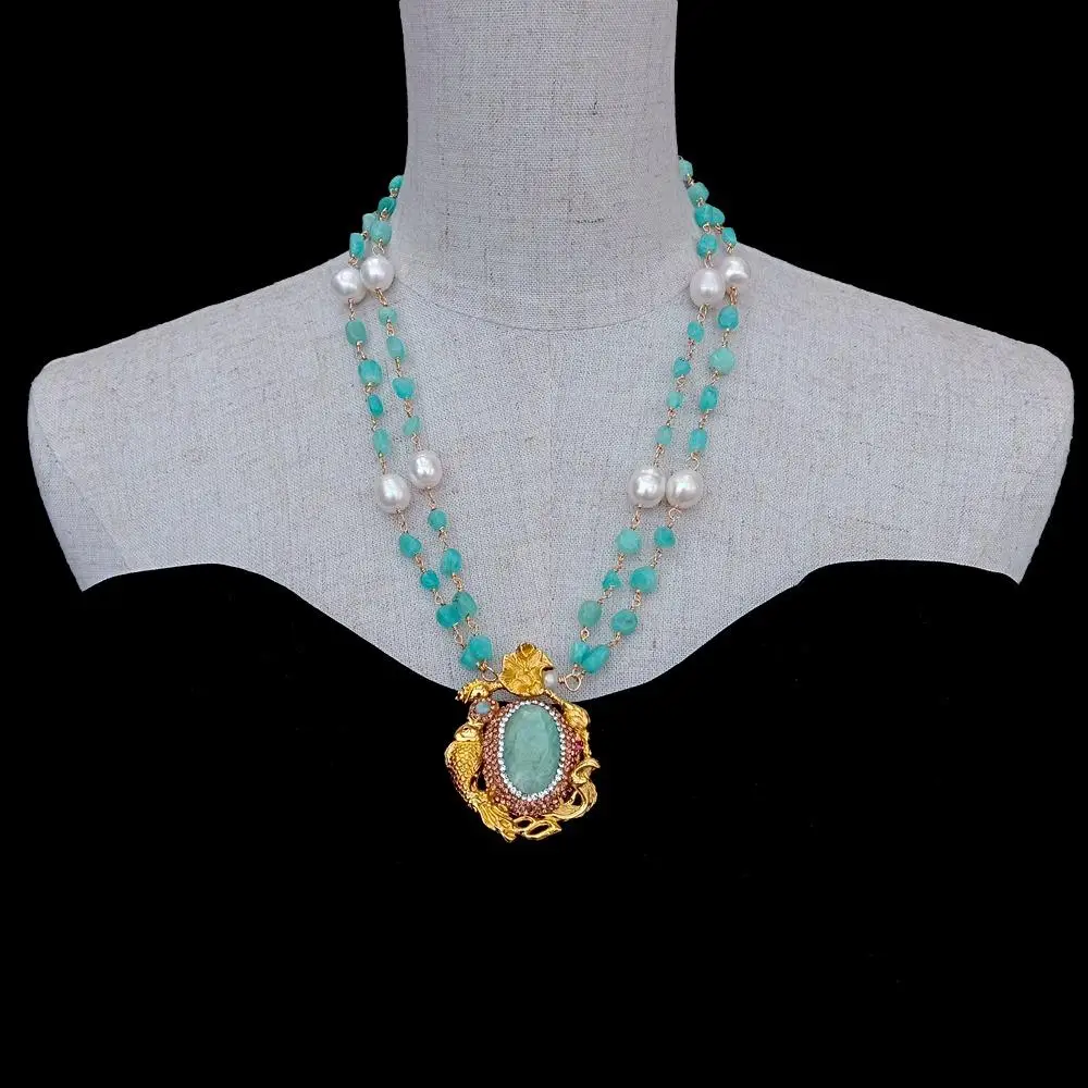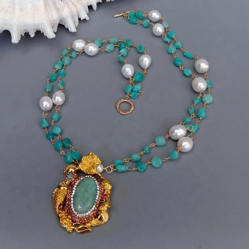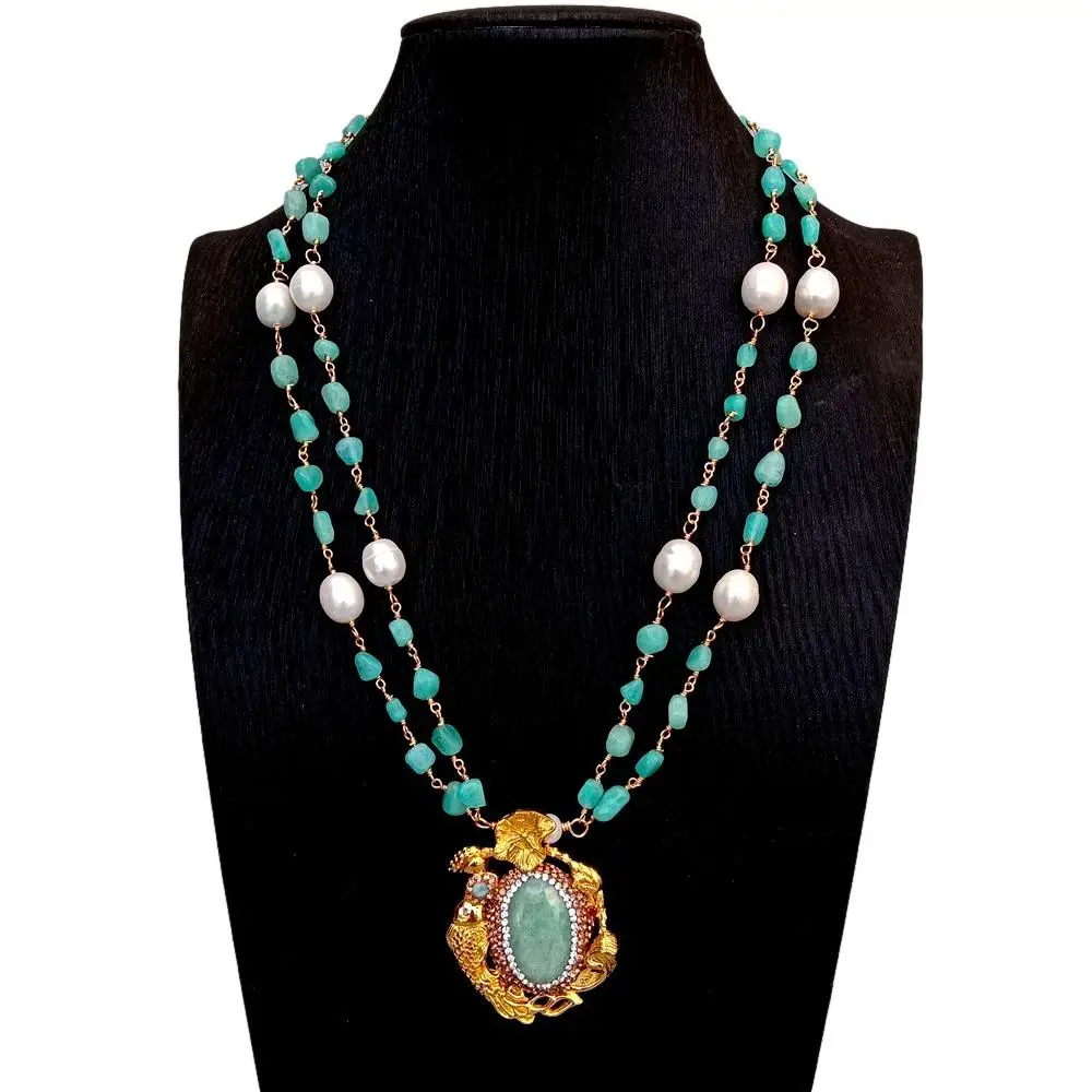 • 2 Rows Cultured White Rice Pearl Blue Amazonite Necklace Green Amazonite Gold Plated Pendant