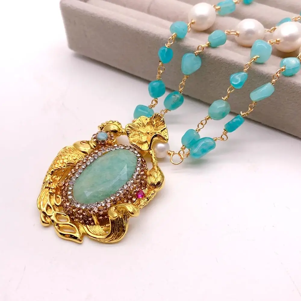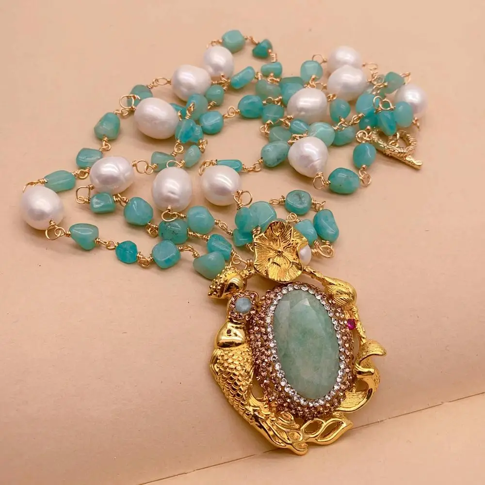 Gems Info: freshwater cultured pearl, white rice pearl, natural blue amazonite bead, green amazonite gold plated pendant.