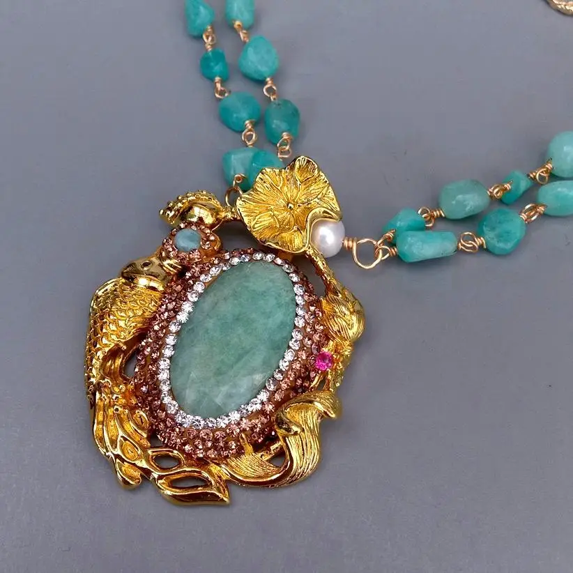 2 Rows Cultured White Rice Pearl Blue Amazonite Necklace Green Amazonite Gold Plated Pendant