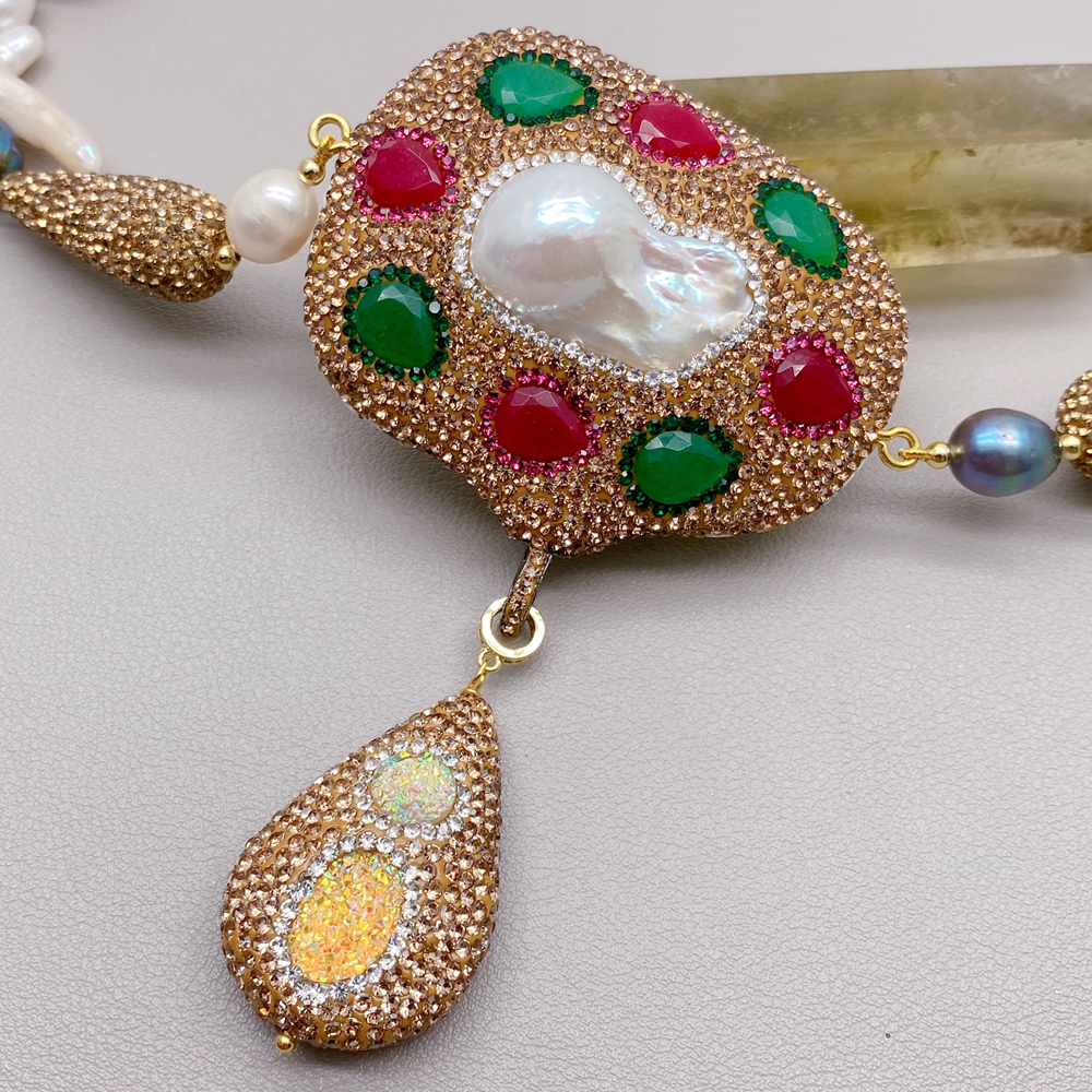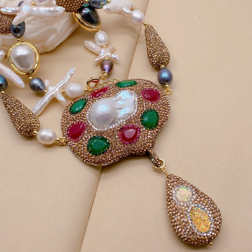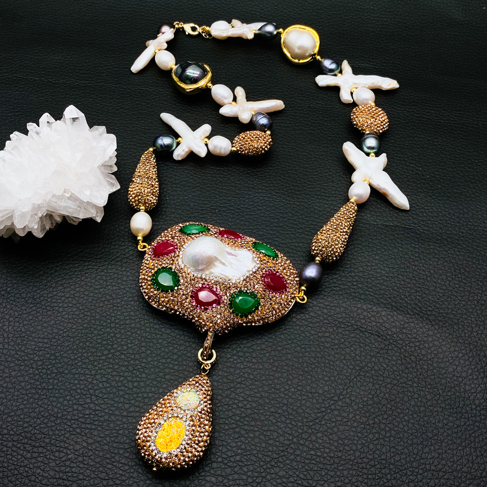 Gems Info:  white nucleated baroque pearl pendant, white cross pearl, crystal pave beads.