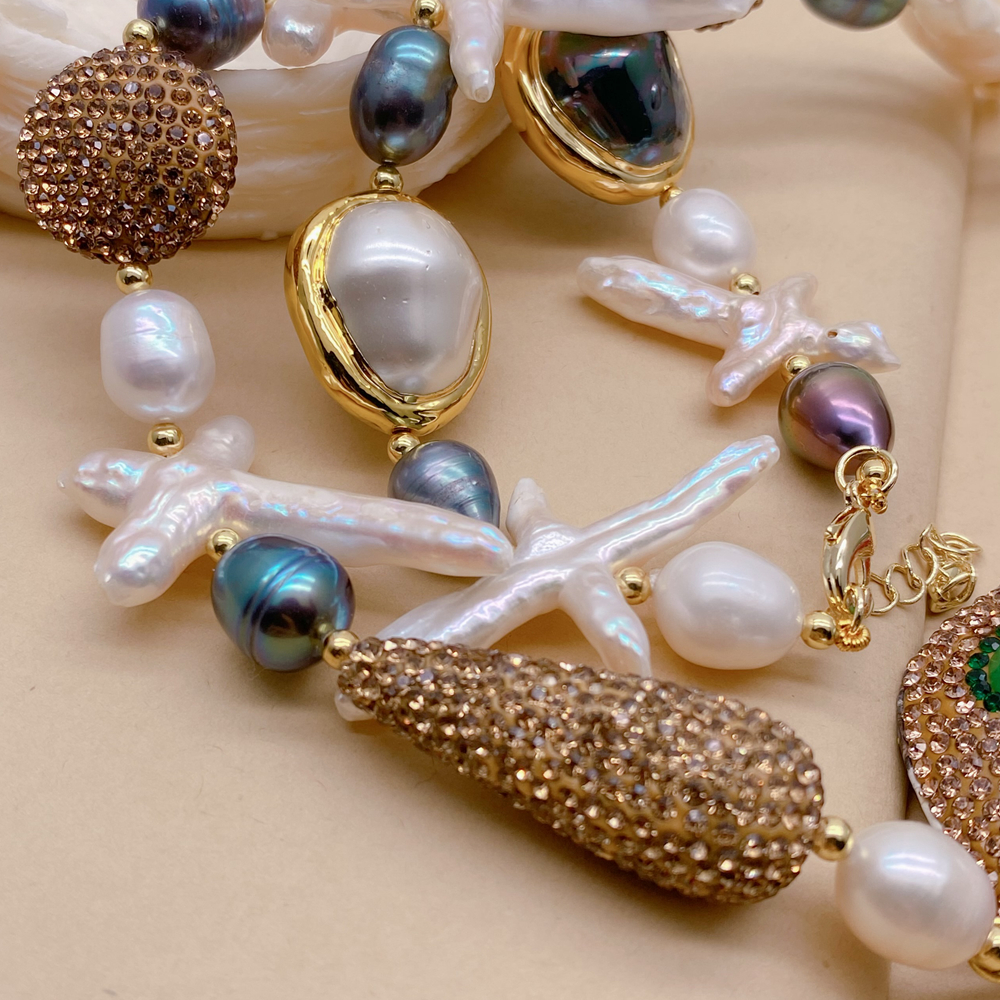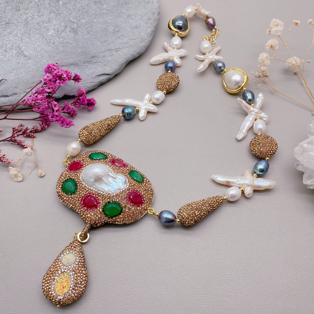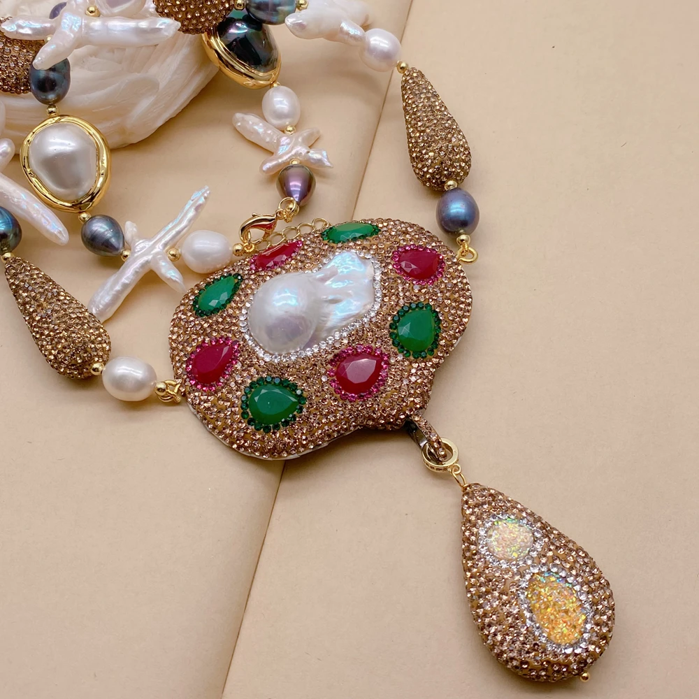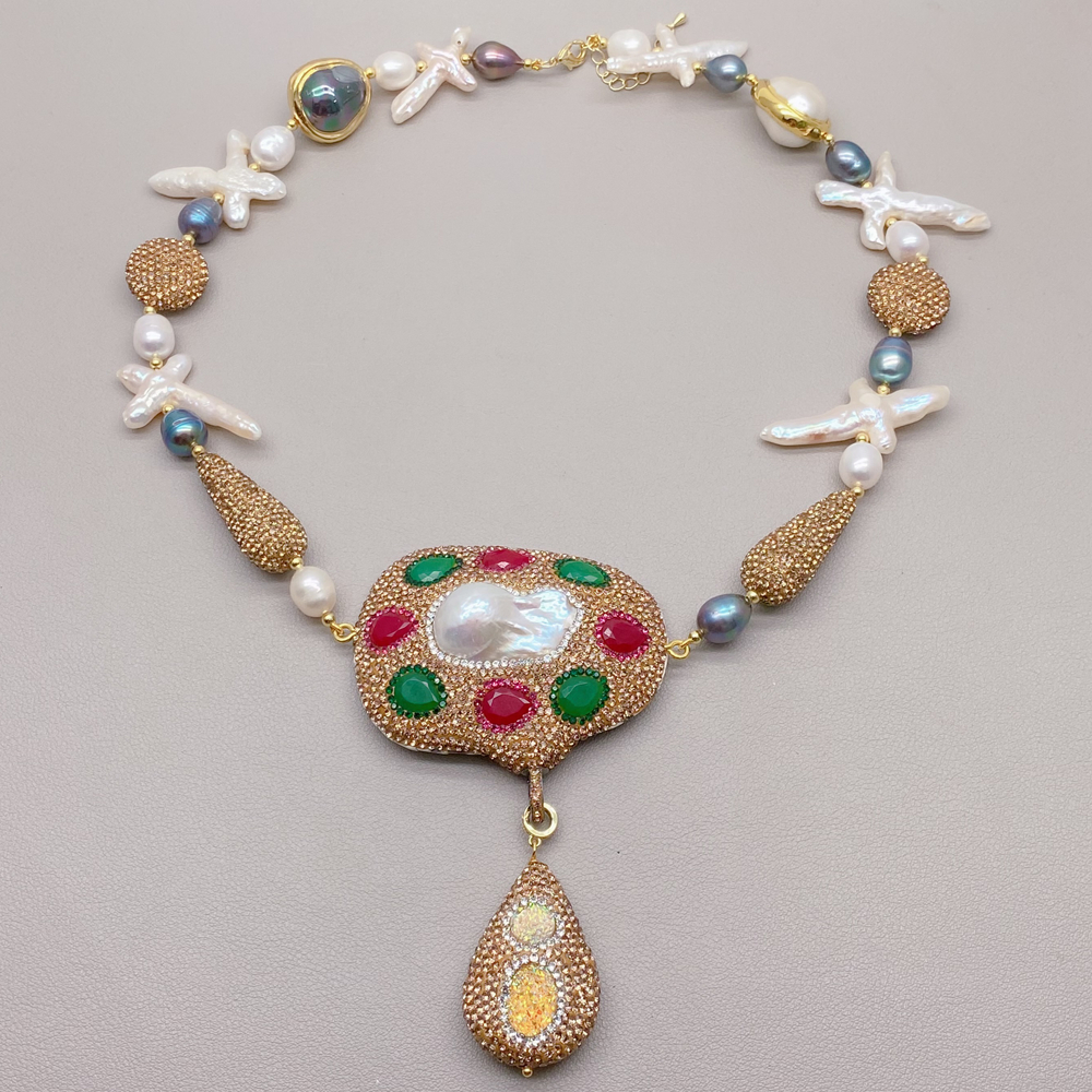 Gems Info:  white nucleated baroque pearl pendant, white cross pearl, crystal pave beads.