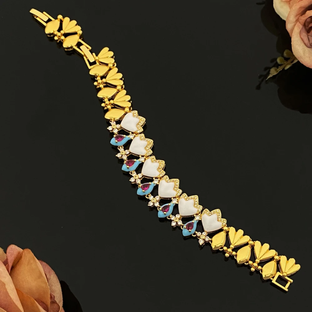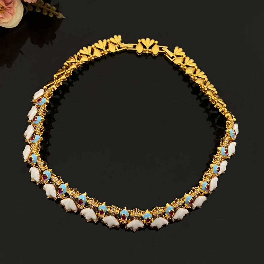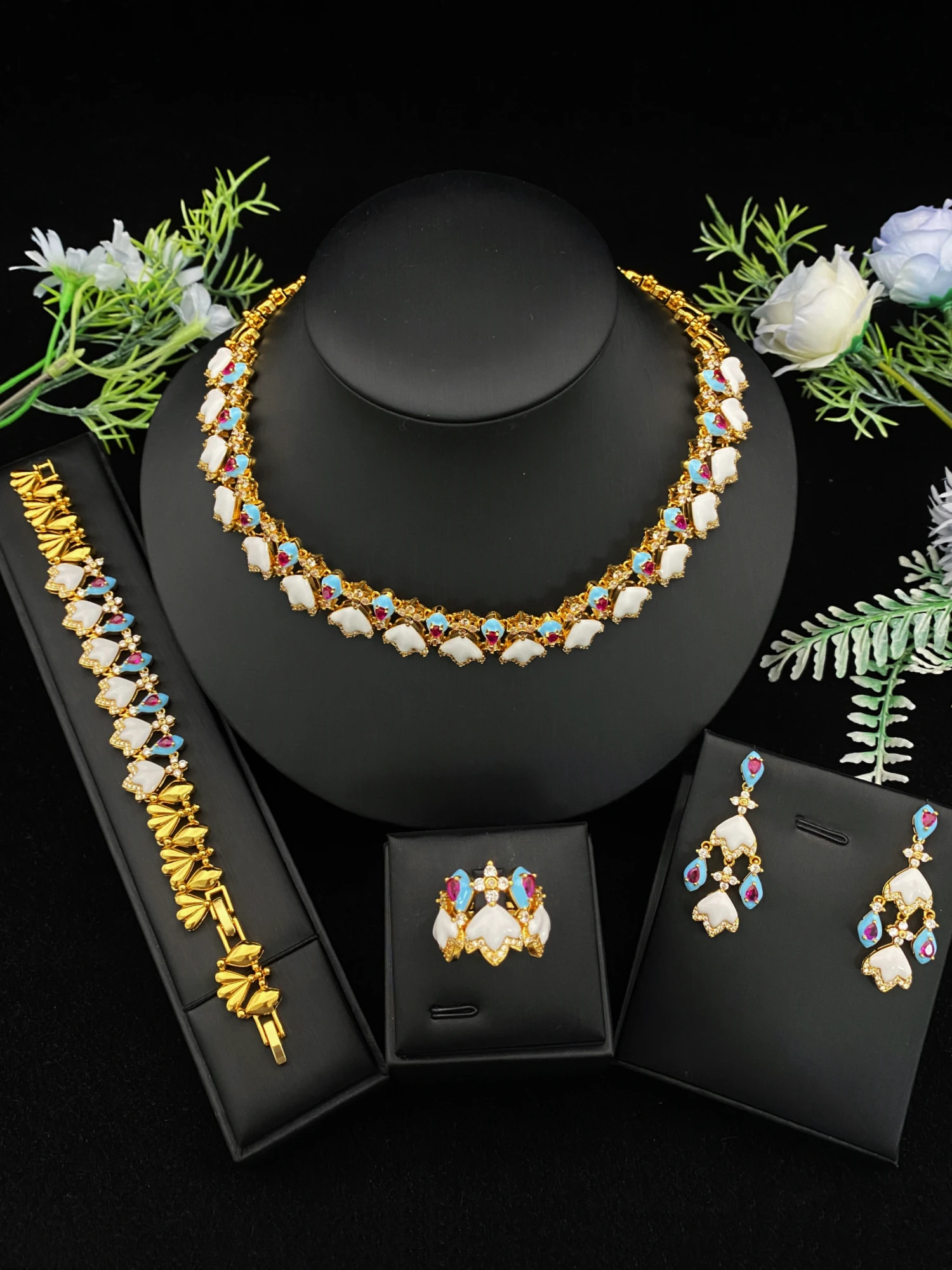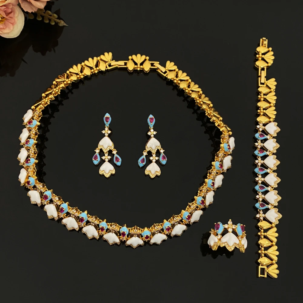 • Shining Gold Plated Copper Jewelry Set for Women Zirconia Embellished Bracelet Ring Necklace Earrings Perfect for Banquet