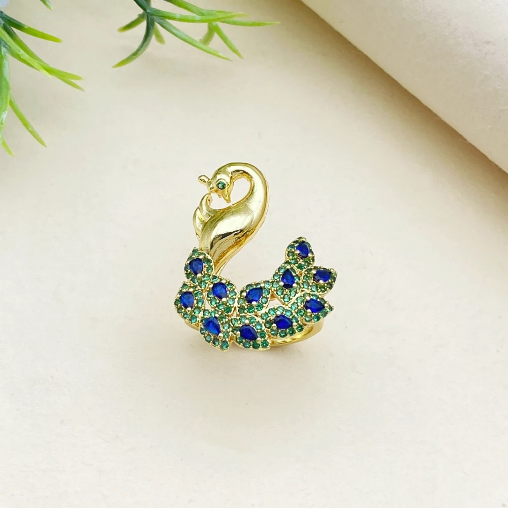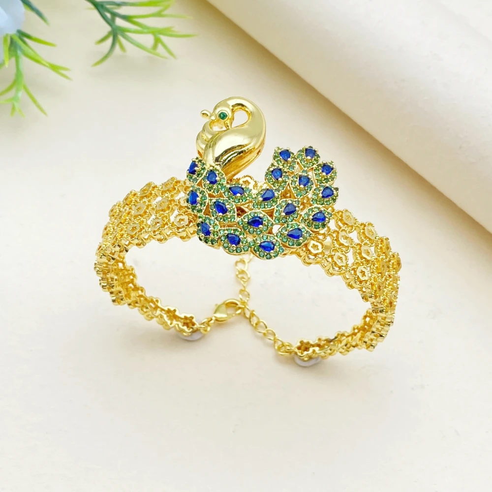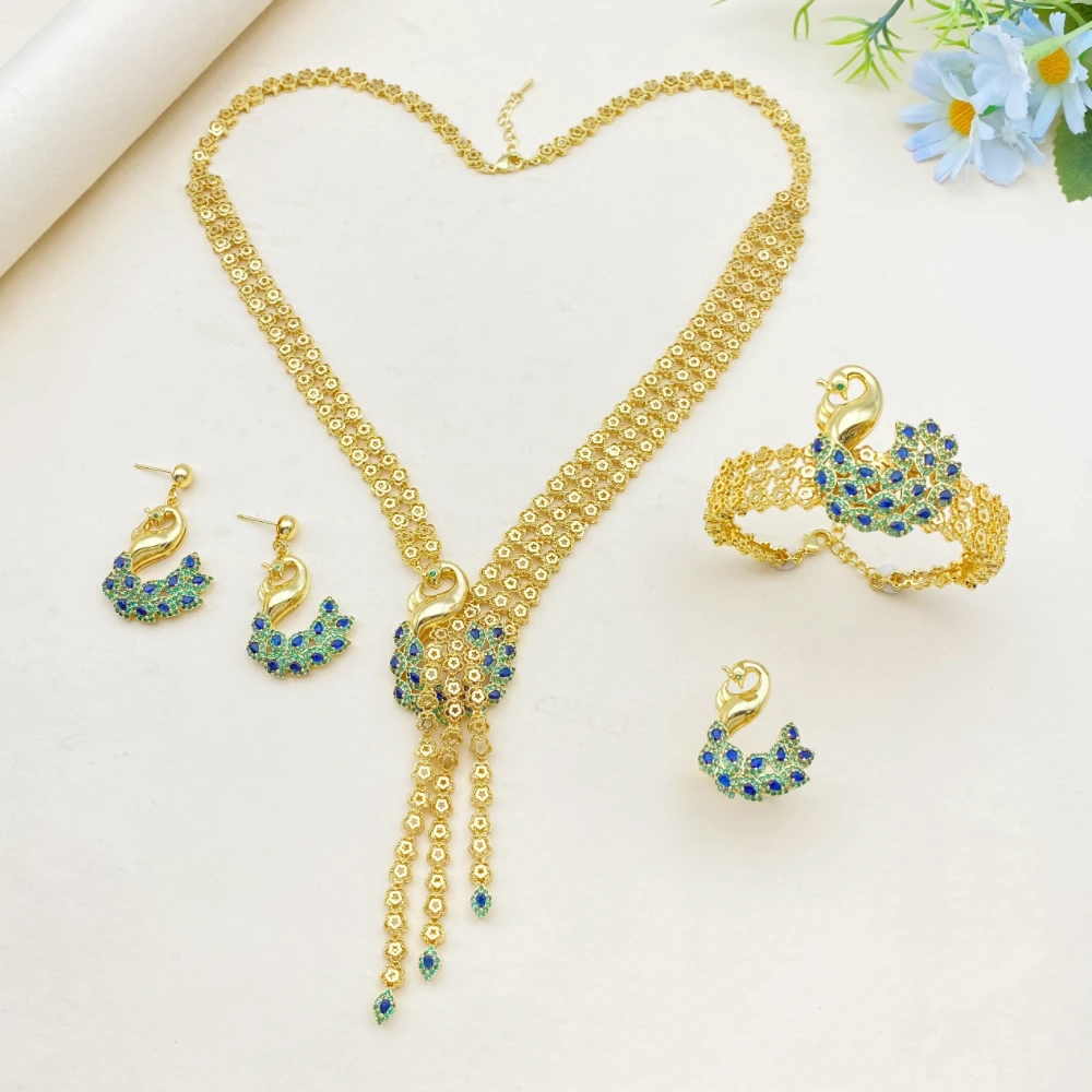 • African Wedding Jewelry Set Peacock Shaped Gold-Plated Copper Artificial Zircon Bracelet Ring Necklace Earrings