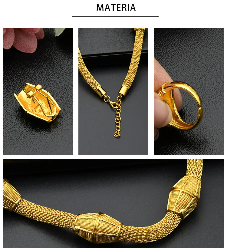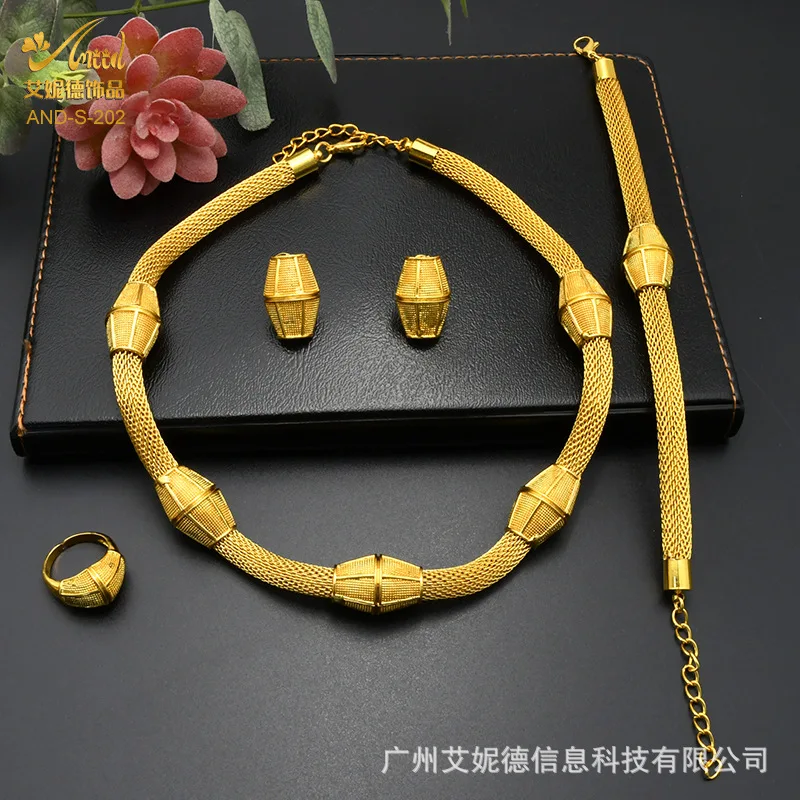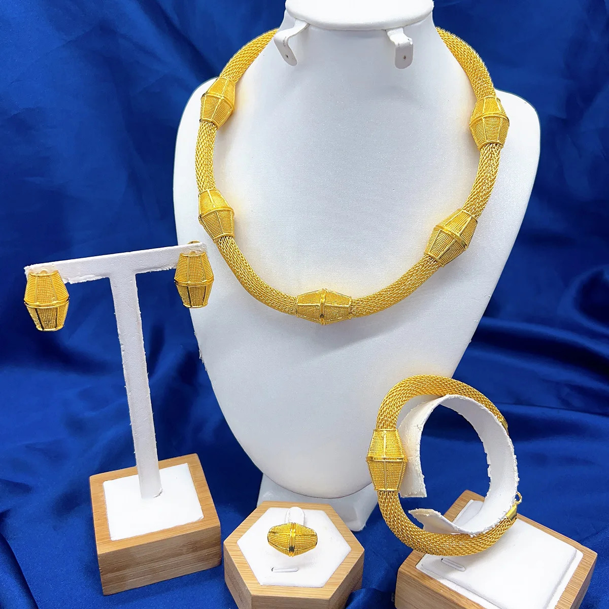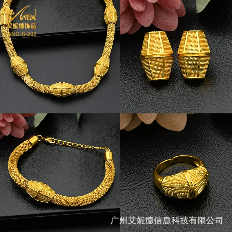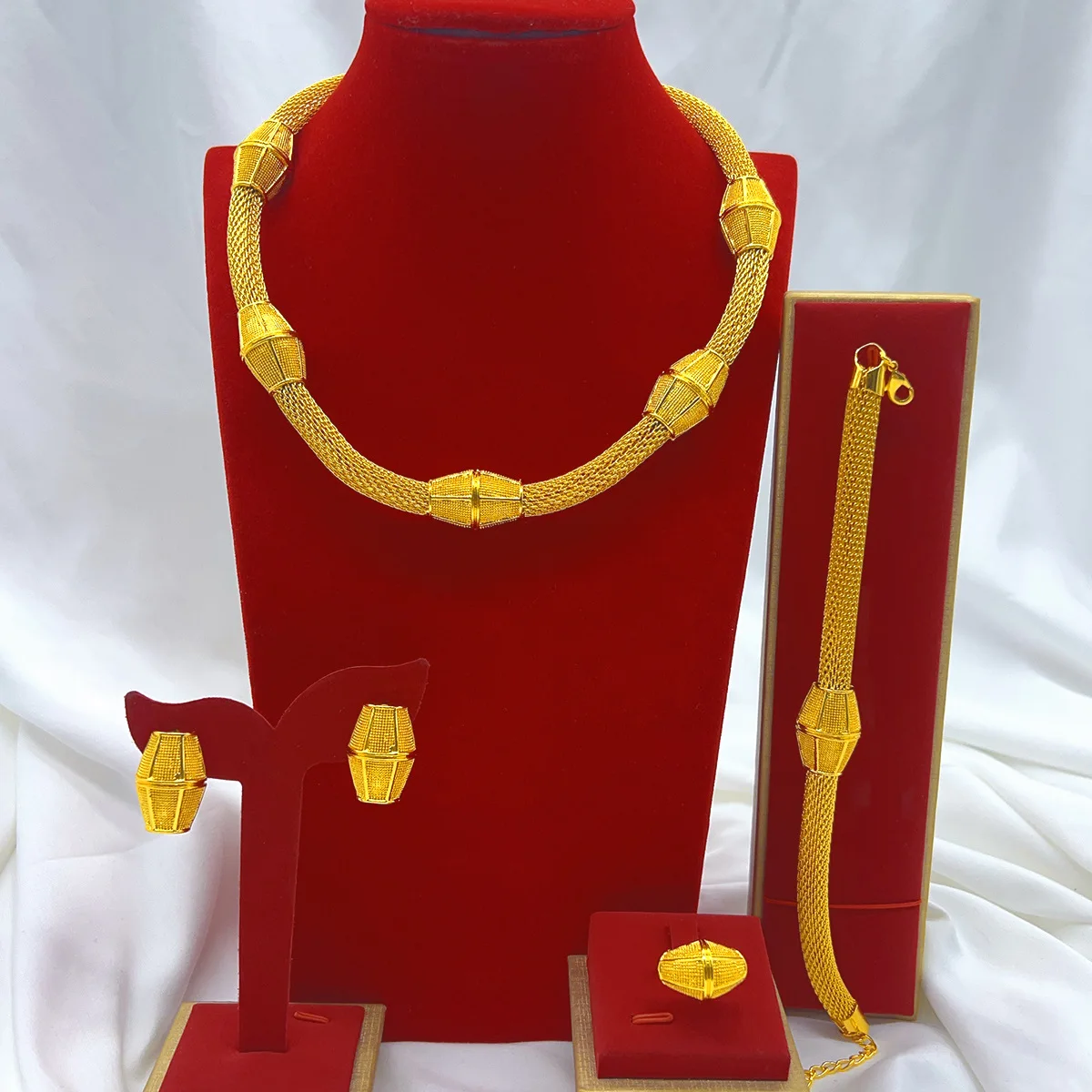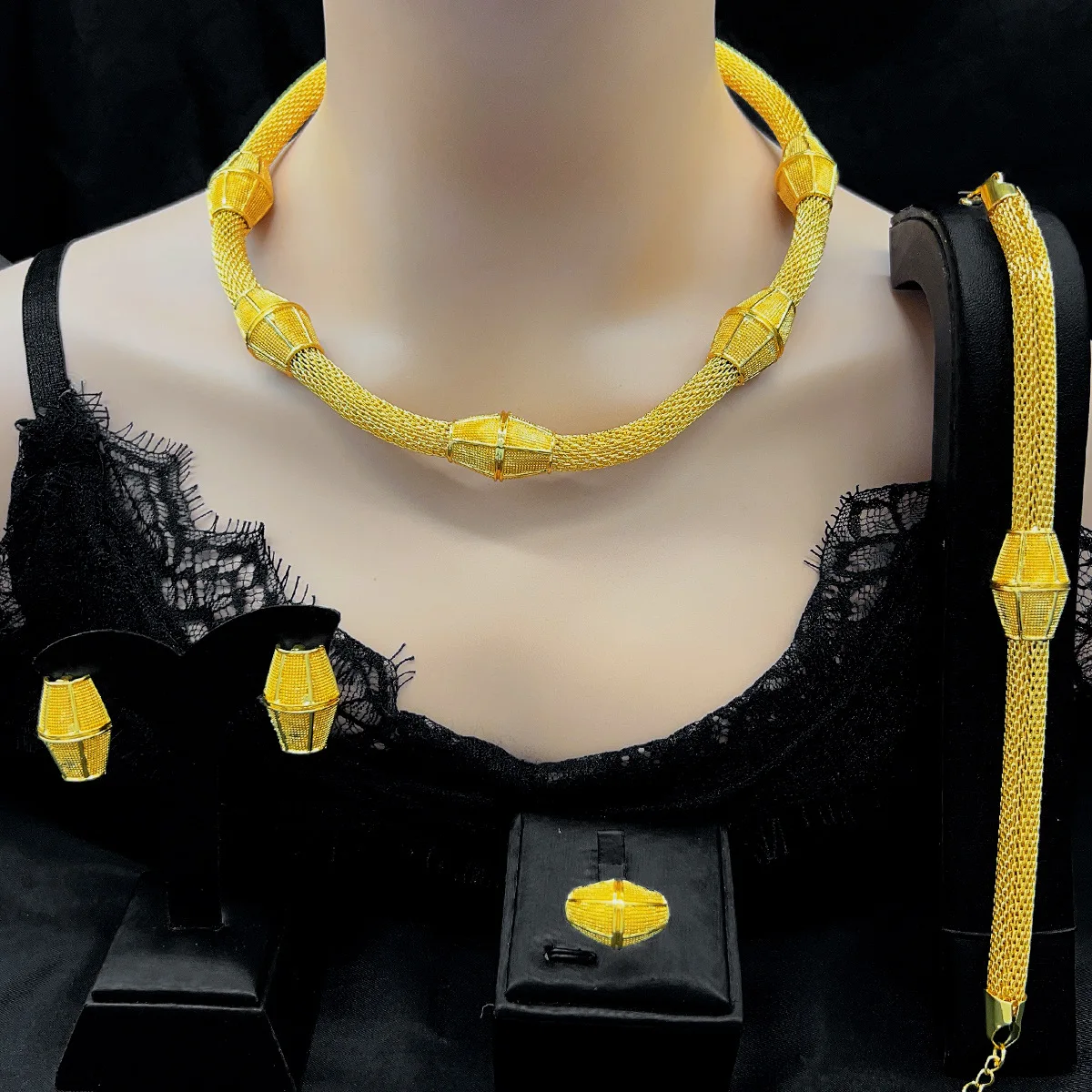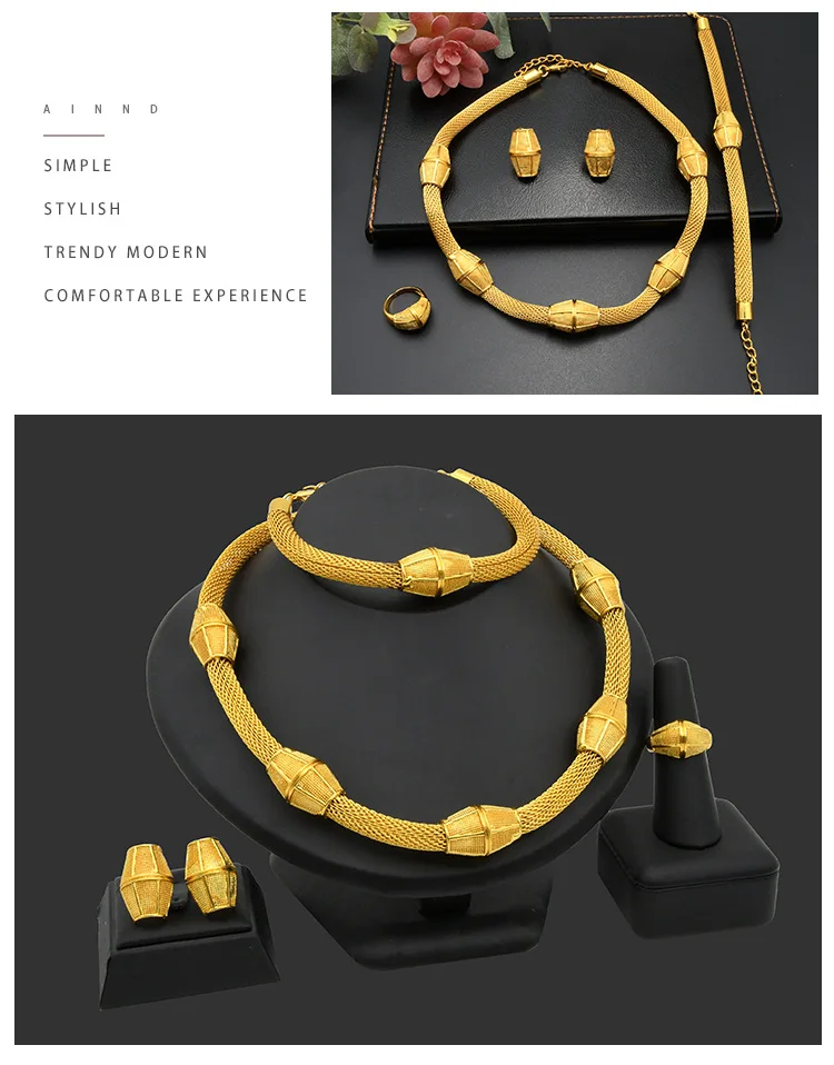 • Women 24K Gold AU999 Simple Fashion Necklace Bracelet Earrings Ring 4-Piece Set - Age-friendly, ideal for gifting & personal use
